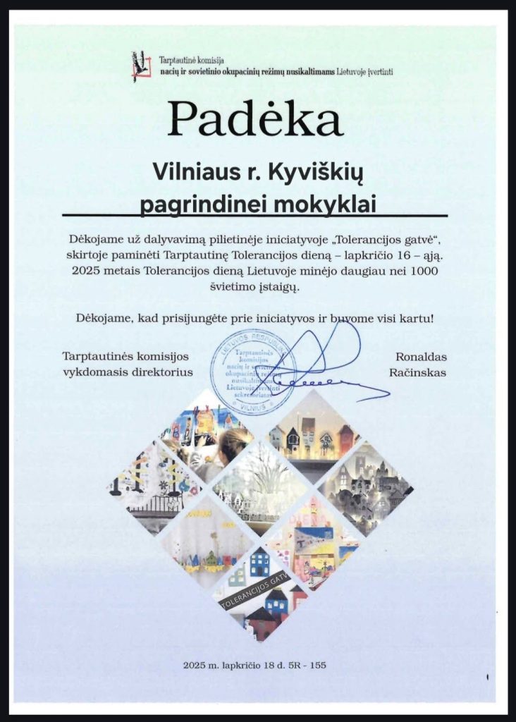Lapkričio 15 dieną, mokykloje buvo paminėta Tarptautinė tolerancijos diena. Pirmos ir antros pamokos metu, susirinkus visiems mokiniams, dailės ir technologijų mokytoja Violeta Petkevič papasakojo apie šios dienos istoriją ir prasmę. Šių metų tolerancijos simbolis yra ,,Vėjo malūnėlis”. Kūrybinių dirbtuvių metu mokiniai sukūrė daugybę spalvotų vėjo malūnėlių, juose užrašė prasmingus žodžius. Vėjo malūnėliai papuošė mokyklos erdvę.
