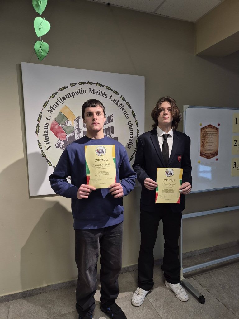 Sausio 12 dieną Marijampolio Meilės Lukšienės gimnazijoje vyko Vilniaus rajono lietuvių kalbos ir literatūros olimpiada Lietuvos ir užsienio lietuviškų mokyklų 9-12/I-IV gimnazijos klasių mokiniams. Mūsų mokyklai atstovavo 9 klasės mokiniai – Ernest Adnopol ir Marek Pačkovski.